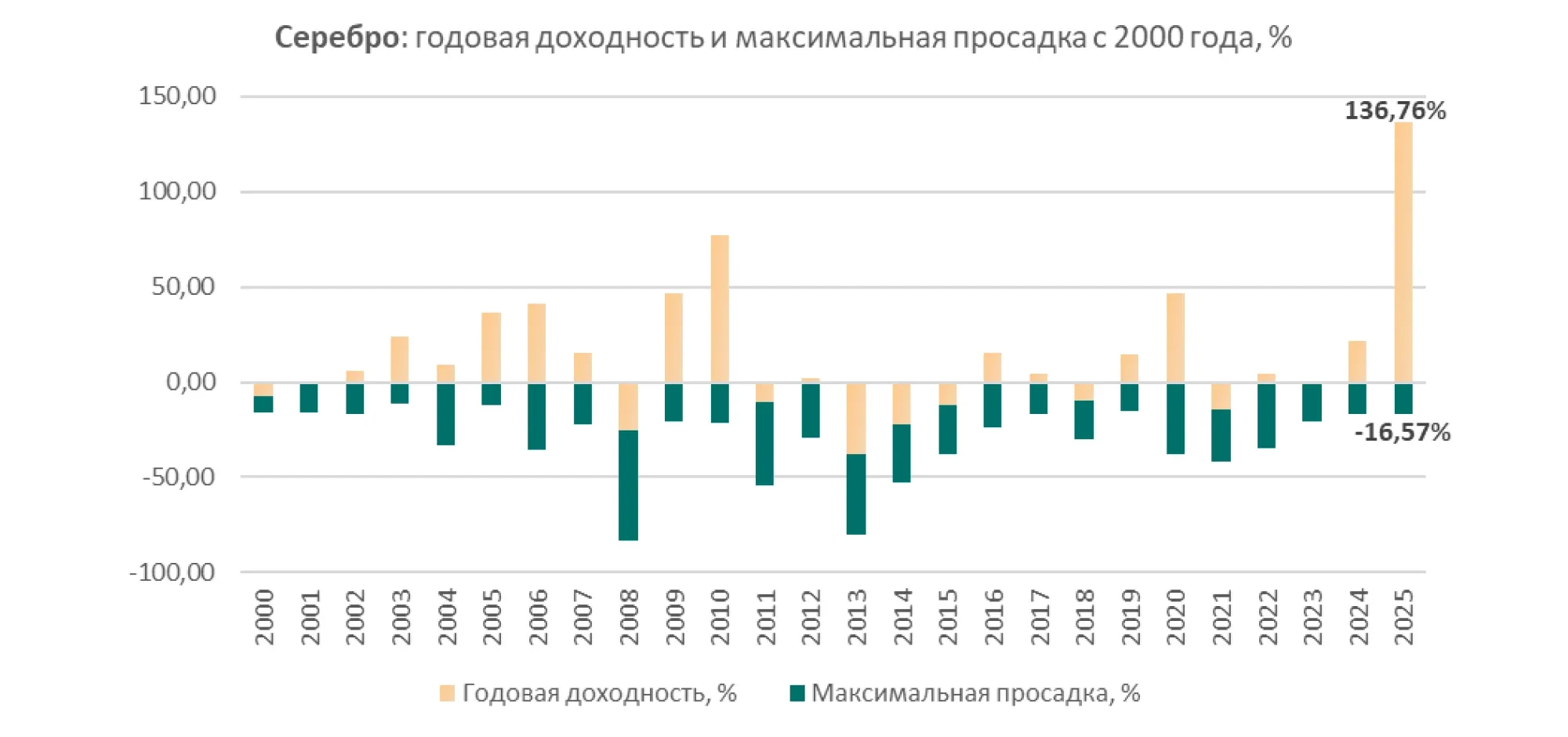Тем не менее, фундаментальные факторы поддерживали восходящий тренд, и просадки привлекали новых покупателей - эффект FOMO («fear of missing out», или страх упустить выгоду) проявился и на рынке серебра. В итоге 2025 год стал для серебра одним из лучших в современной истории: по доходности металл значительно опередил золото.