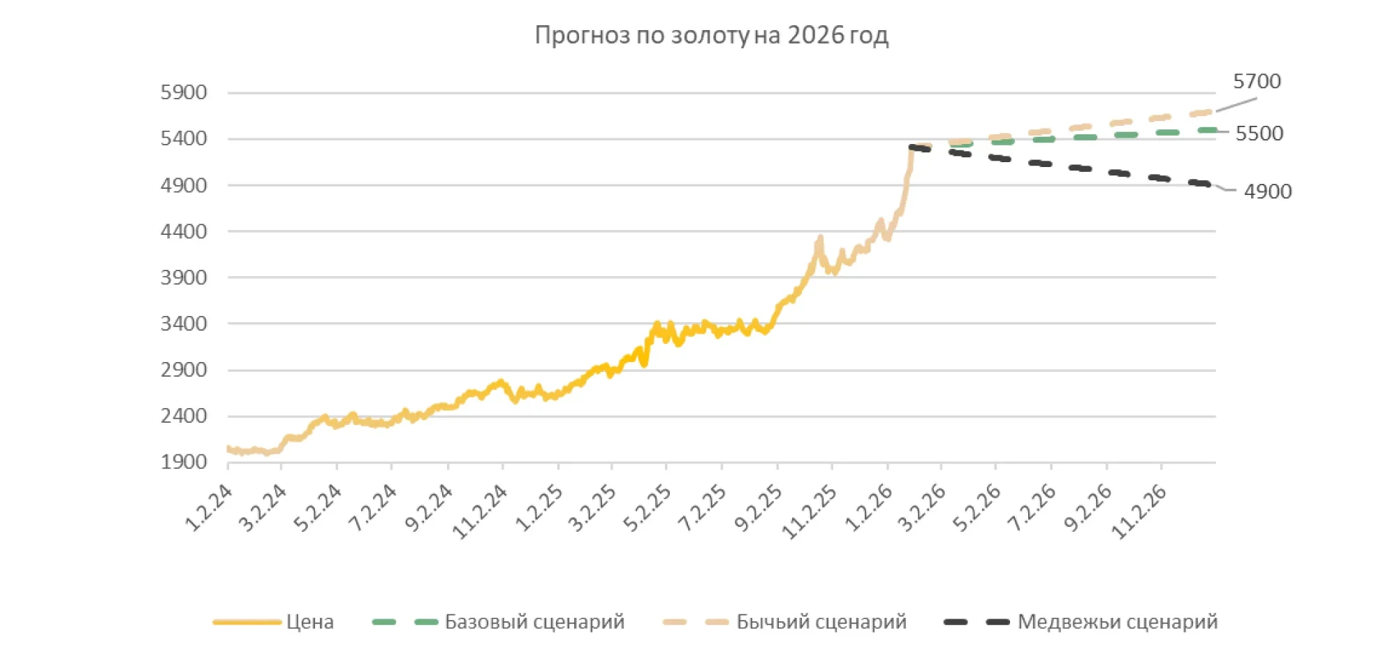 В нашем базовом сценарии мы допускали, что в течение текущего года цена золота может подняться в район $4 900 за унцию. Однако рынок реализовал этот рост существенно быстрее ожидаемого: в текущих условиях золото растёт ускоренными темпами, и на данный момент цена уже находится вблизи $5 200. Это означает, что первоначальная базовая траектория фактически была «пройдена» заранее, и риск смещения итогового диапазона по году вверх заметно увеличился.