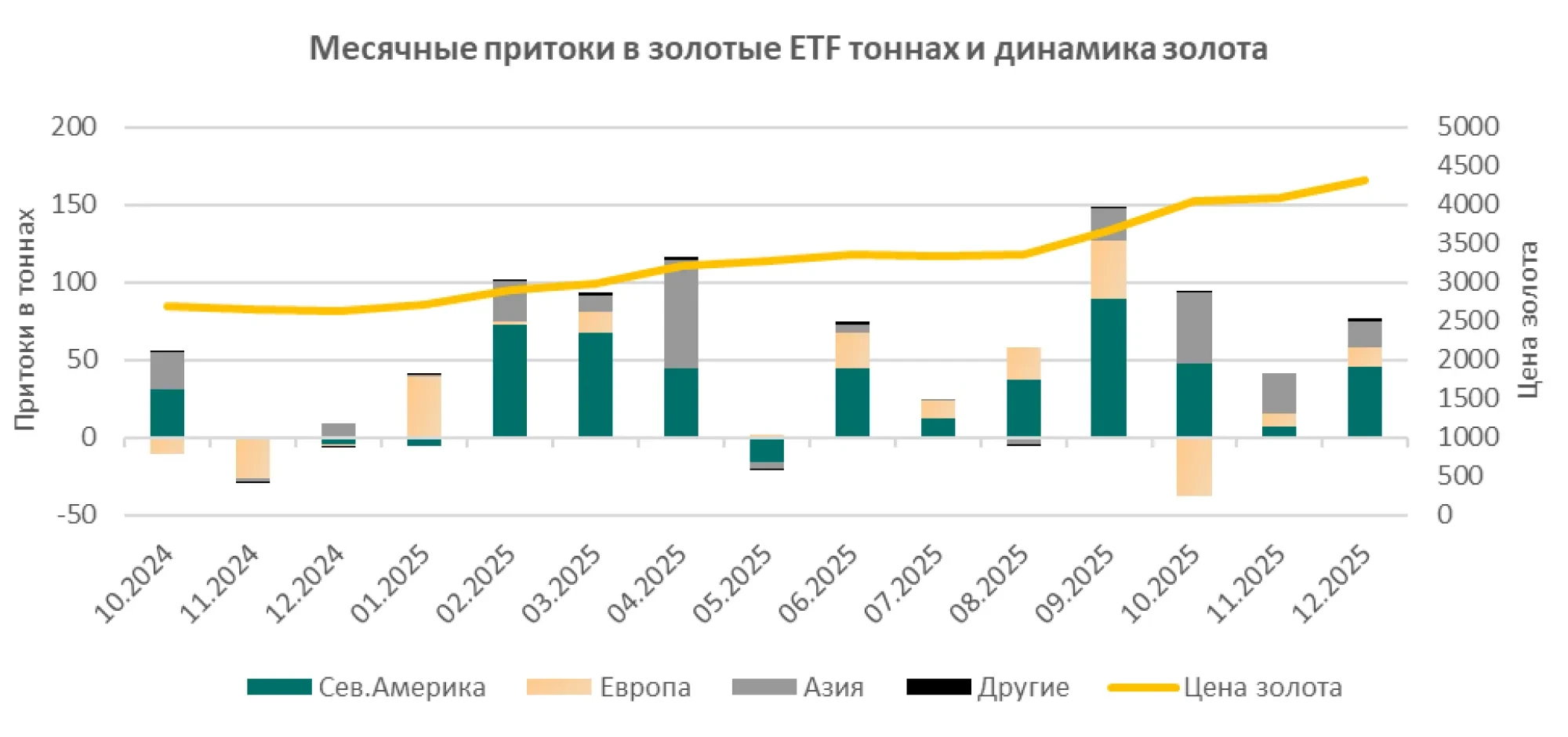 Потоки в золотые биржевые фонды (ETF) развернулись вверх: за 2025 год ETF практически полностью компенсировали отток предыдущих четырёх лет, продемонстрировав рекордные месячные притоки (около $17 млрд в одном только сентябре) - крупнейший ежемесячный приток за всё время наблюдений.