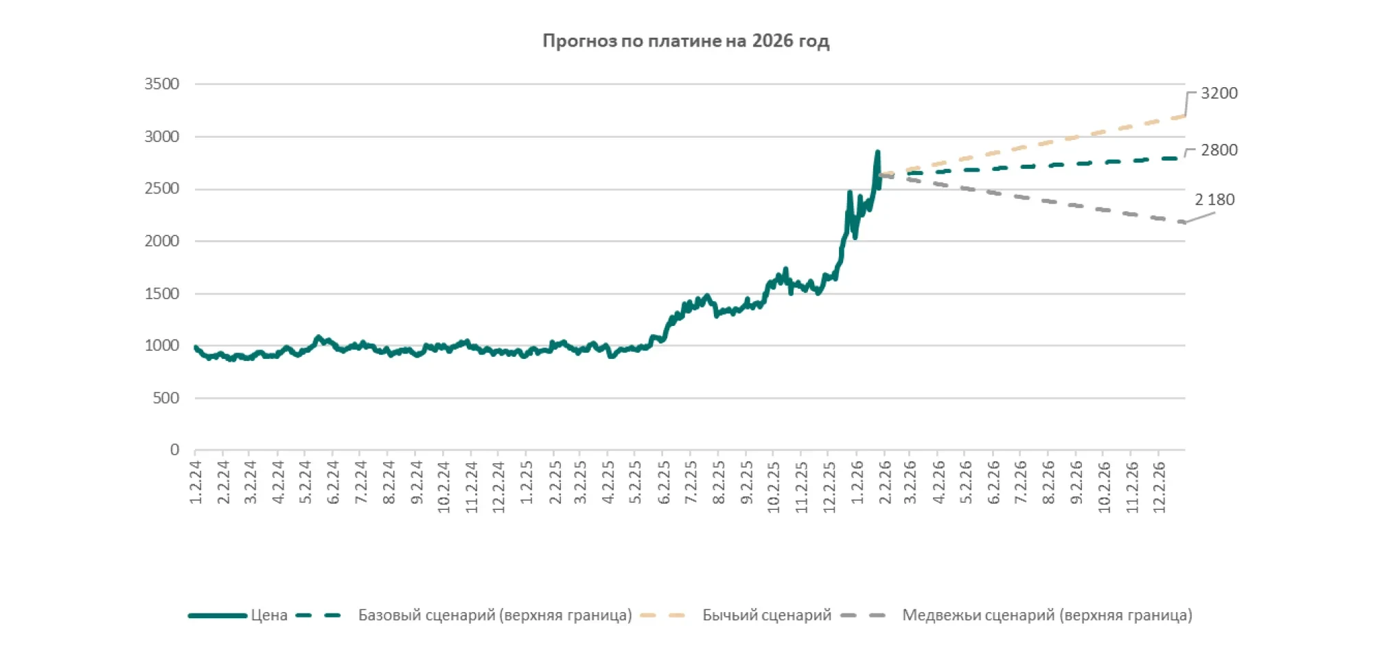 Важно учитывать и точку входа: в 2025 году платина выросла на 123%, то есть рынок входит в 2026-й уже после очень сильного ралли. На этом фоне консенсус-прогнозы (Bloomberg, на 28.01.2026) закладывают заметно более сдержанную траекторию по платине к концу 2026 года: медиана по 4кв26 около $1 675/унц., при очень широком диапазоне оценок от $1 150 до $2 700. Среди наиболее значимых домов диапазон ожиданий тоже разнородный: JPMorgan ориентируется примерно на $1 650 к 4кв26, Morgan Stanley около $1 850, Citigroup около $2 100, Standard Chartered около $2 450, Commerzbank до $2 700 (4кв26).