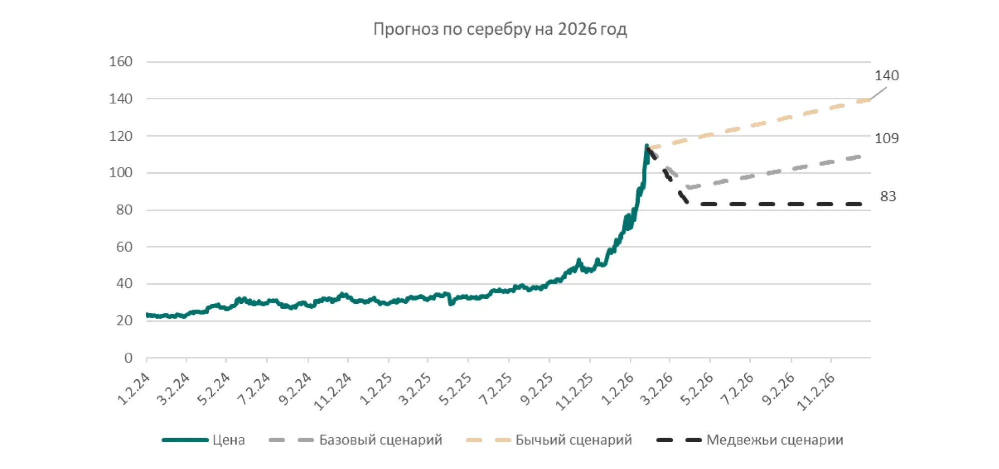 В медвежьем сценарии (охлаждение «risk-on», фиксация прибыли, укрепление доллара или ухудшение циклического фона) серебро после коррекции может застрять в диапазоне $83-92, без быстрого восстановления к более высоким уровням.